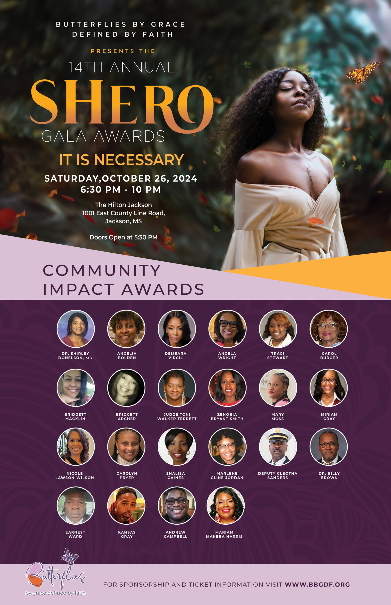 Butterflies By Grace Defined By Faith (BBGDF) is pleased to invite you to join us at the 14th Annual SHERO Gala Awards Dinner on Saturday, October 26, 2024, at 6:30 pm for a special evening celebrating our 14th anniversary and honoring this year’s recipients of advocates, survivors, and change makers.