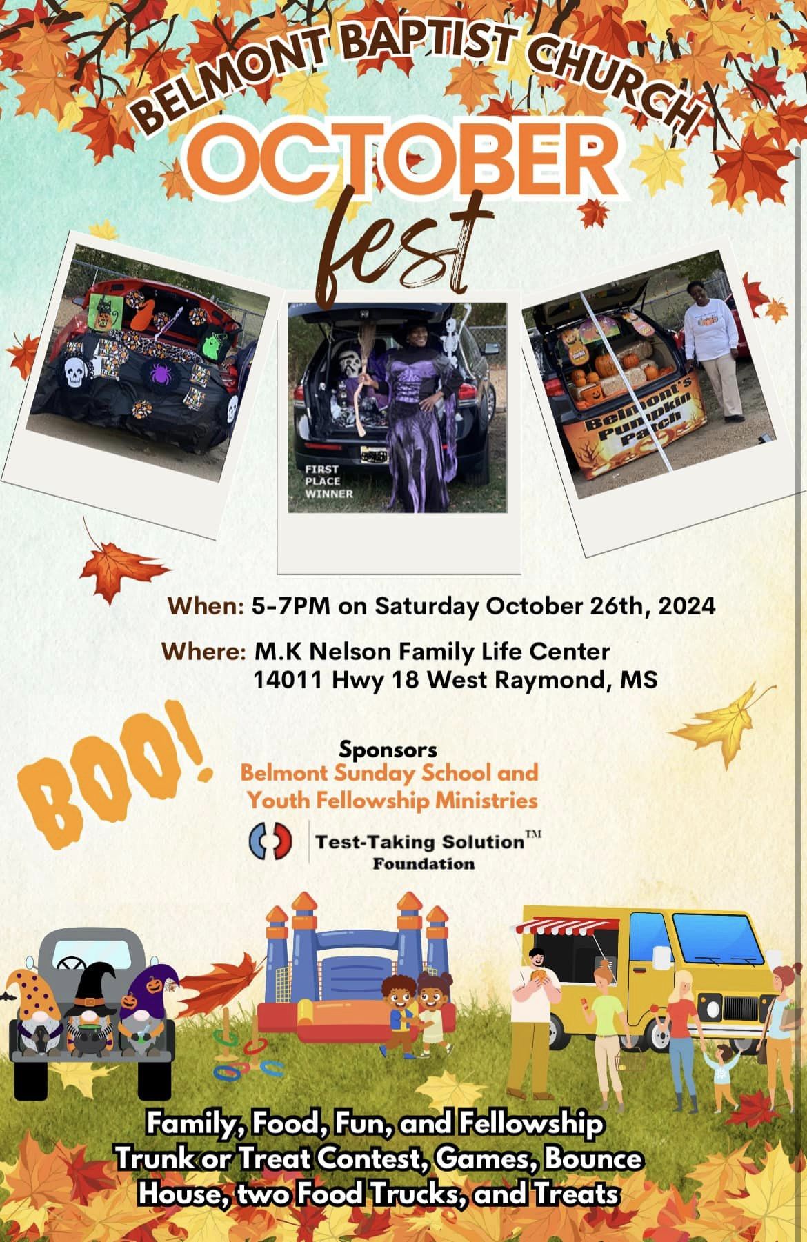 Enjoy family, food, fun, and fellowship at the Belmont Baptist Church October fest, which will be held on October 26, 2024, from 5:00 p.m. to 7:00 p.m. in Raymond, MS.
