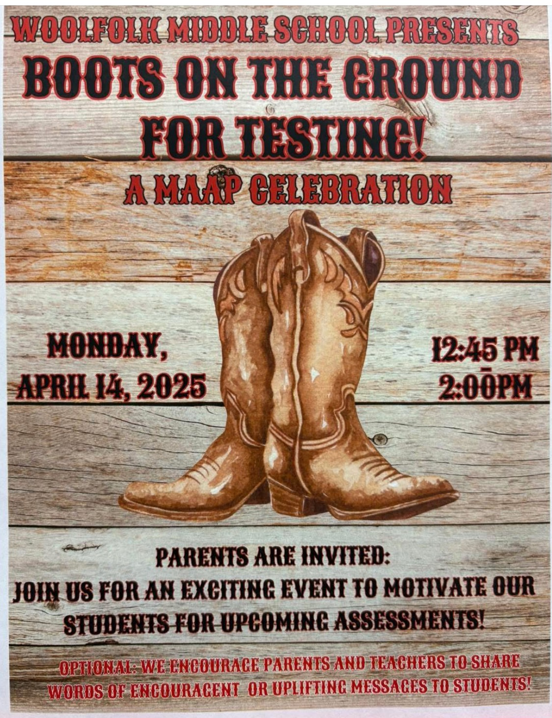 Join Woolfolk Middle School for an exciting event, Boots on the Ground for Testing, on Monday, April 14, 2025, from 12:45 PM to 2:00 PM. This celebration is designed to motivate and uplift students as they prepare for their upcoming assessments.
