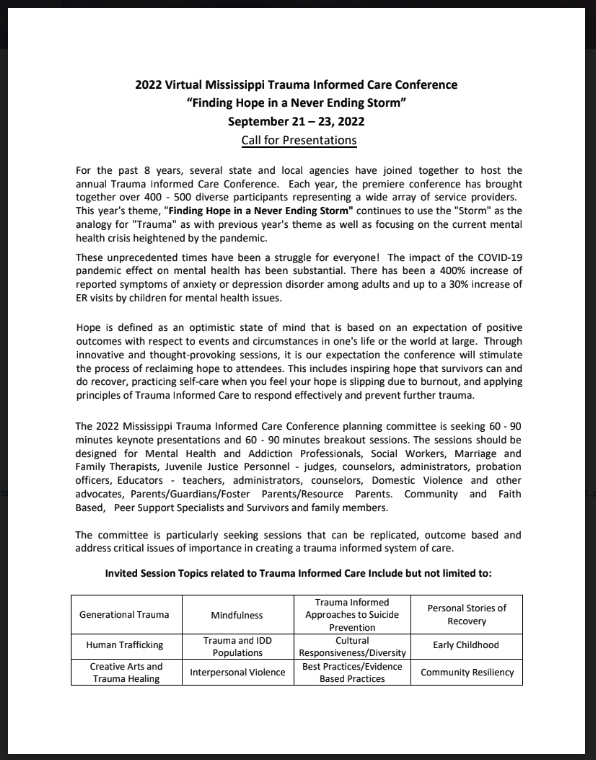 The 2022 Mississippi Trauma Informed Care Conference planning committee is seeking 60 – 90
