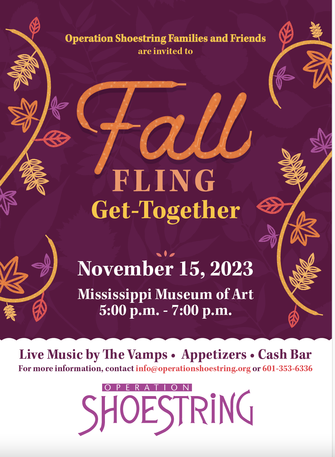 Join Operation Shoestring for Fall Fling as we celebrate our community’s successes! This past year, our partner schools at JPS increased their school’s rating, and Project Rise and our parent workshops yielded positive outcomes for Shoestring kids and families. These wins are all because of our Shoestring community, friends, and family, and we’d love to celebrate with you this November 15th. We’ll have snacks, live music, and lots of fun while we share some great news about our programs here at Operation Shoestring.