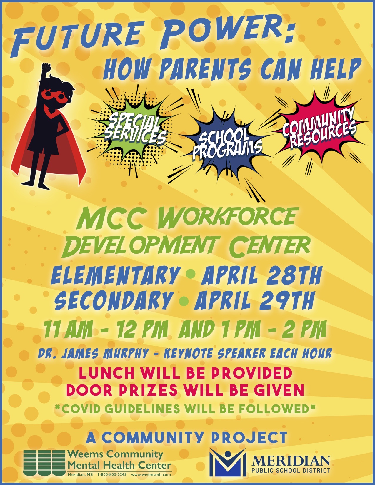 The event will take place at the Meridian Community College Workforce Development Center. Parents of Elementary students are invited to come on April 28 from 11 am-Noon or 1 pm-2 pm. Parents of secondary students are invited to come on April 29 from 11 am-Noon or 1 pm-2 pm. The Keynote speaker for each hour will be Dr. James Murphy, District Behavioral Specialist.