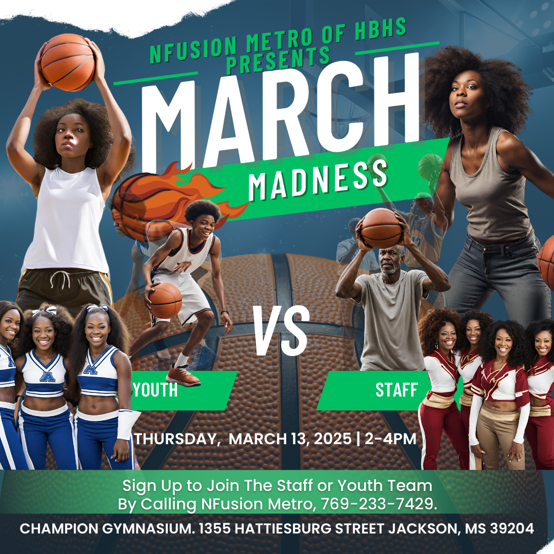 Join us for an exciting afternoon of basketball as the “Youth” team takes on the “Staff” team in a friendly competition presented by NFusion Metro of HBHS! The event will take place on Thursday, March 13, 2025, from 2-4 PM at Champion Gymnasium, 1355 Hattiesburg Street, Jackson, MS. Whether you’re cheering from the stands or playing on the court, this is your chance to be part of the action. Sign up now to join the team by calling NFusion Metro at 769-233-7429. Don’t miss this fun-filled community event!