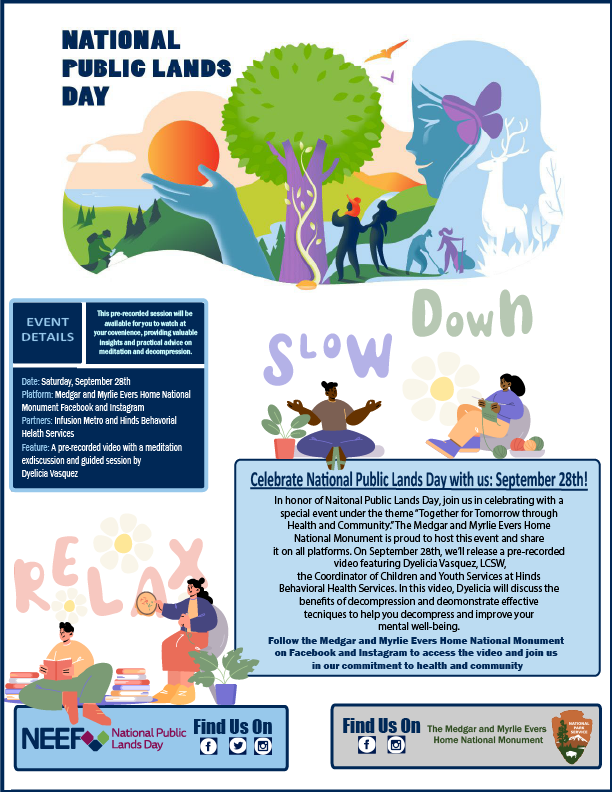 In honor of National Public Lands Day, join in the celebration with a special event under the theme “Together for Tomorrow through Health and Community”. The Medgar and Myrlie Evers Home National Monument is proud to host and share this event on all platforms.