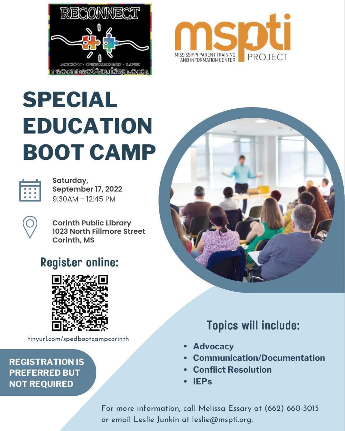 You don’t want to miss this upcoming Special Education Boot Camp on Saturday, September 17 from 9:30 a.m. to 12:45 p.m. at the Corinth Public Library. Topics will include advocacy, communication/documentation, conflict resolutions, and IEPs. Registration is not required but is preferred so we’ll know how many to plan for.