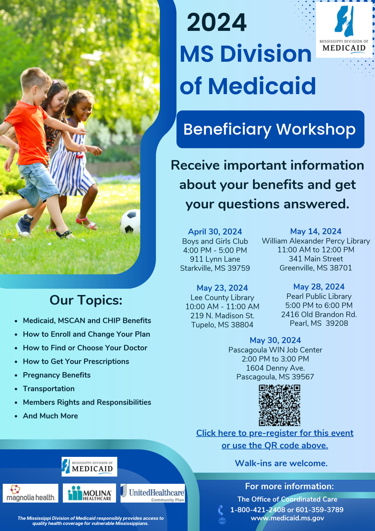 Welcome to your special invitation to the Spring 2024 MS Division of Medicaid Beneficiary Workshops, which will be held on May 23rd, 2024. Please come out and learn about the different Medicaid health plans for the State of Mississippi. Your physicians, staff members, and patients/members are welcome to attend and learn all about the benefits of their Medicaid health plan. The workshops will include United Healthcare, Molina Healthcare, and Magnolia Health presentations.
