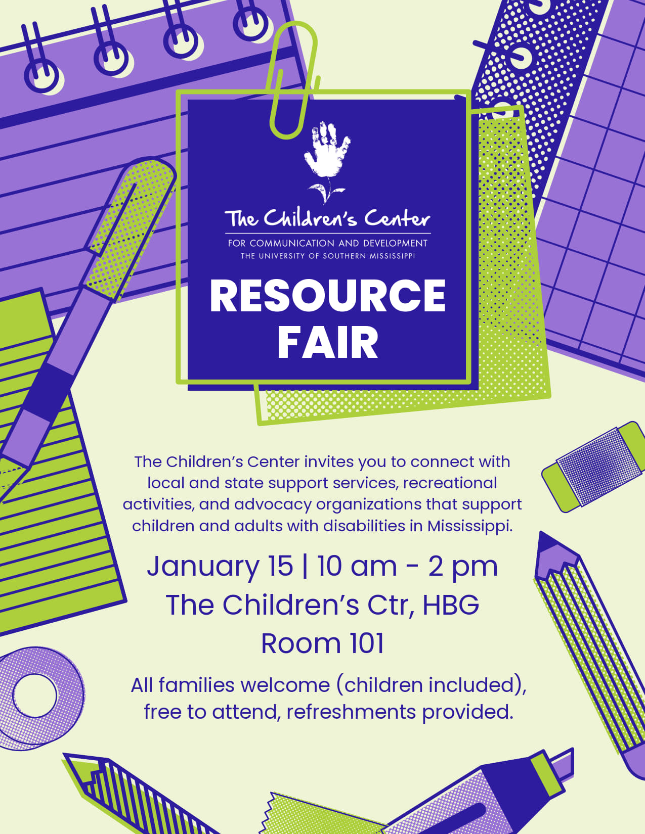 The Children’s Center invites you to connect with local and state support services, recreational activities, and advocacy organizations that support children and adults with disabilities in Mississippi.