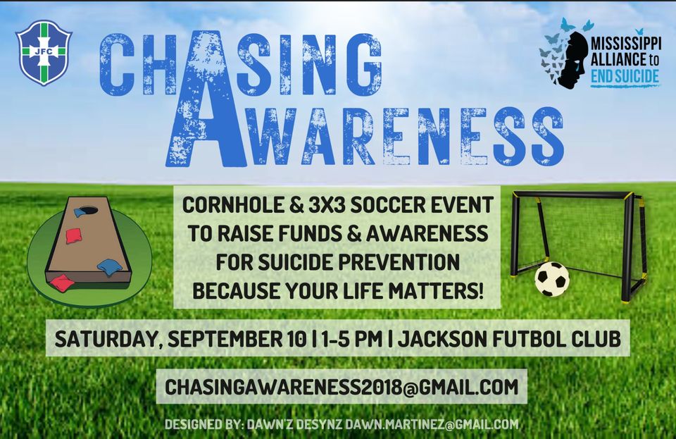 Jackson Futbol ClubJoin Jackson Futbol Club for their first Mississippi Chasing Awareness event to help raise funds for Suicide Prevention. All proceeds will go to MATES - Mississippi Alliance to End Suicide. Cornhole games, 3v3 soccer games, and prizes to raffle off. There will be food trucks there as well. In memory of Chase Lanke and all […]