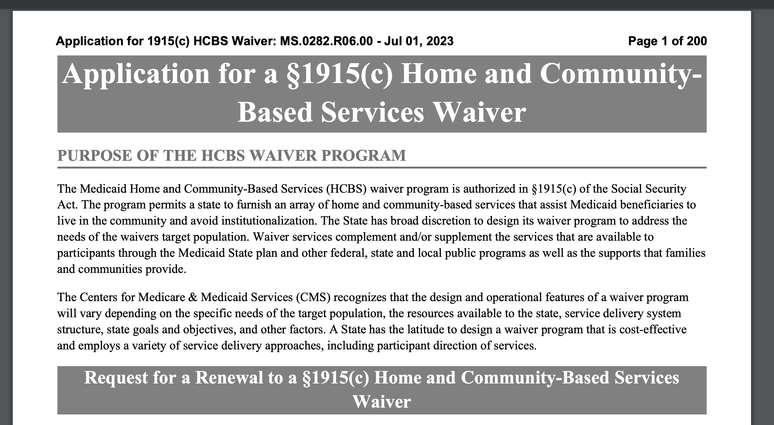 The Mississippi Division of Medicaid (DOM) reported that it “submitted to the Centers for Medicare and Medicaid Services (CMS) the Intellectual Disabilities/Developmental Disabilities (IDDD) Waiver Renewal Application on March 31, 2023,” and that “you can see the pages here: MS IDDD Waiver Renewal Submitted to CMS 3.31.23.” We publicly thank the Division of Medicaid for its responsiveness to our outreach and questions during the renewal application process.