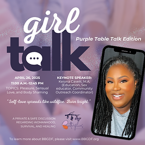 Join Butterflies BBGDF for Girl Talk: Purple Table Talk Edition, an empowering and private space for women to discuss important topics like Pleasure, Sensual Love, and Body Shaming. This session is designed to foster conversations about womanhood, survival, and healing, all in a safe and supportive environment.