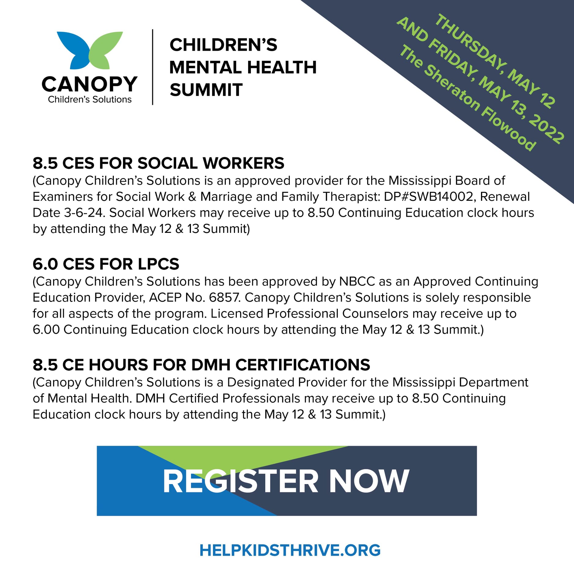 The Children’s Mental Health Summit is Thursday, May 12 and Friday, May 13 at the Sheraton Flowood The Refuge Hotel & Conference Center. Continuing education units are available!