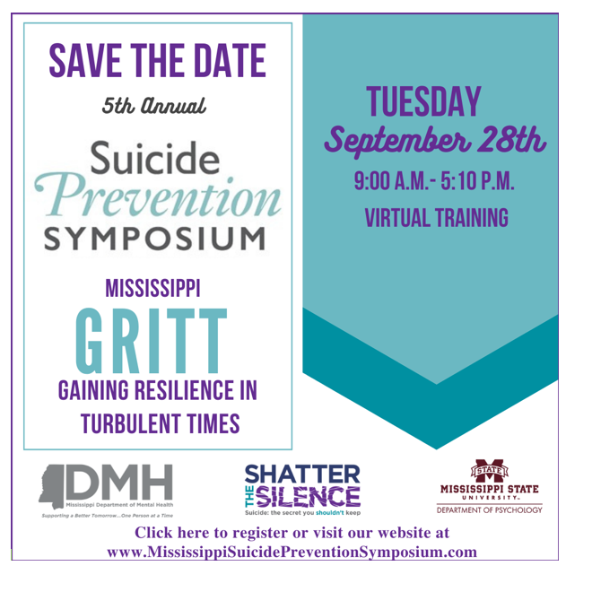 During the September recognition of National Suicide Prevention Month, the Mississippi Department of Mental Health (DMH) is hosting its 5th Annual Suicide Prevention Symposium. Anyone is welcome to participate in the symposium, whether a parent or caregiver, educator, mental health professional, or simply a concerned citizen.