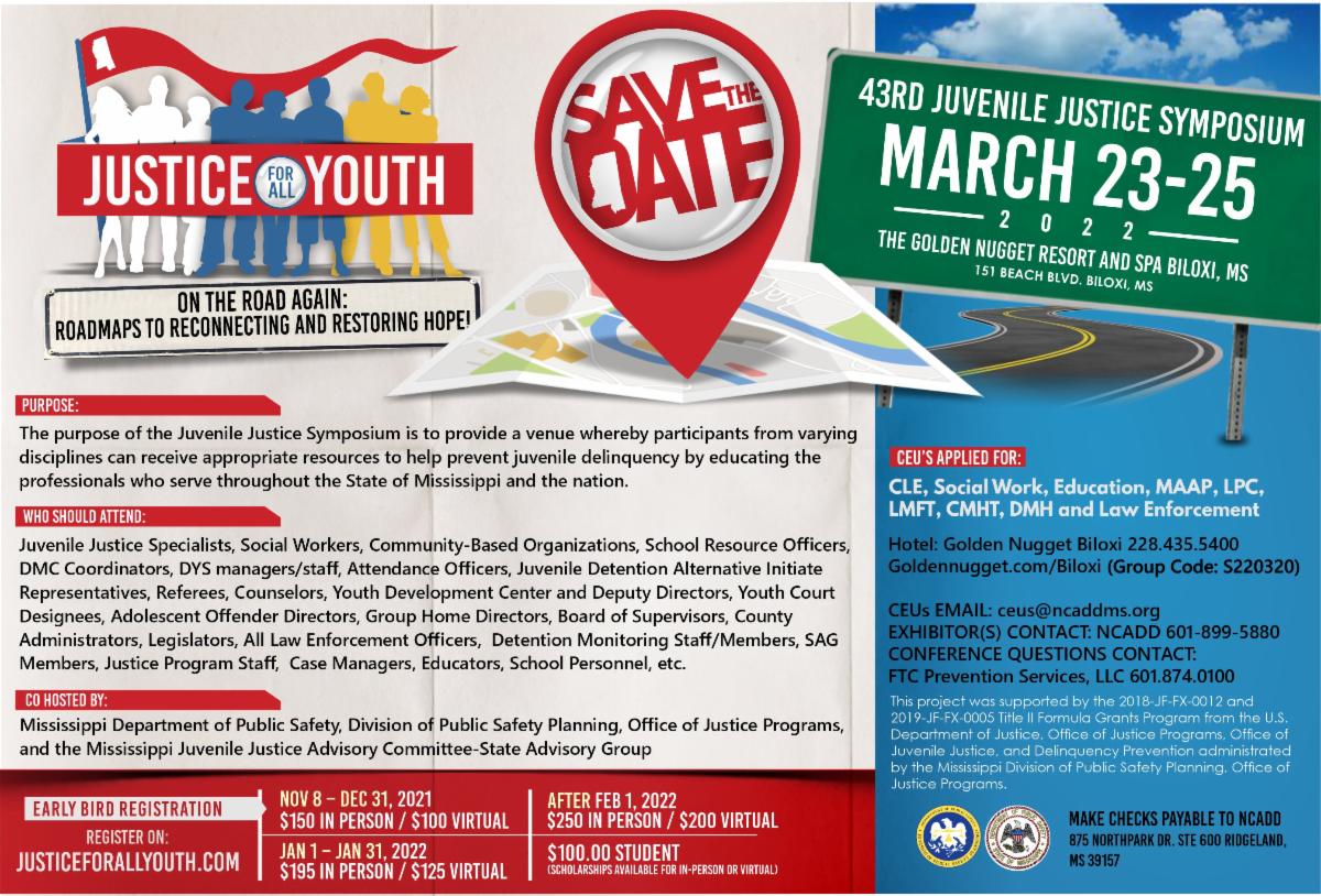 The 43rd Juvenile Justice Symposium will be held virtually and in person in Biloxi, MS on March 23 to 25, 2022.