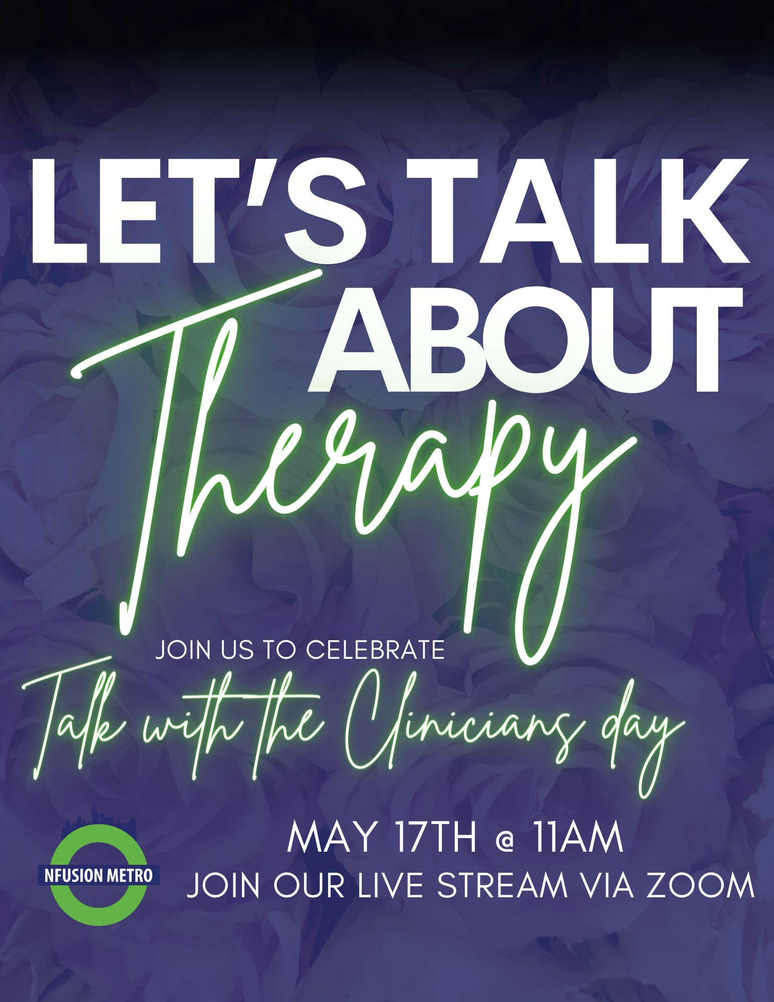 Join Nfusion Metro on May 17th for 'Let's Talk about Therapy.' This is your chance to ask mental health and therapeutic questions directly to professionals. Submit your questions via private message and tune in to our Zoom Live Stream from 11 a.m. to 12 p.m. Let's break the stigma and start the conversation!