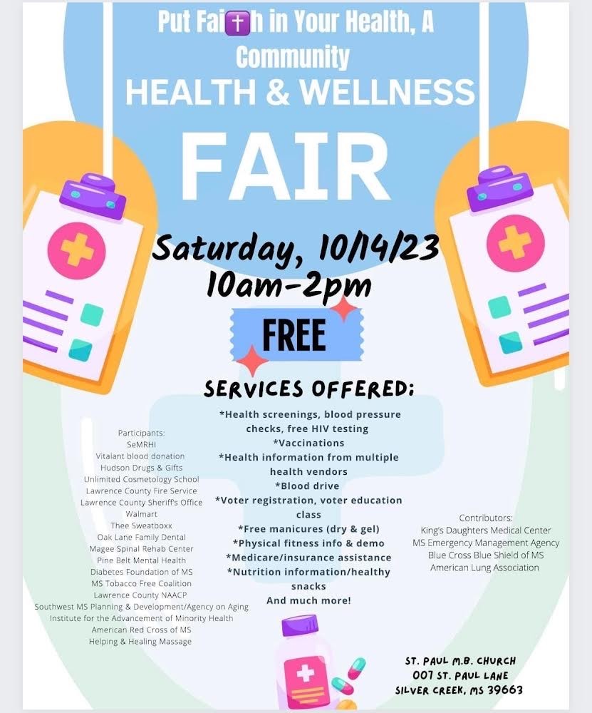St. Paul M.B. Church will host Put Faith in Your Health, A Community Health and Wellness Fair on Saturday, Oct 14, from 10 am - 2 pm. |