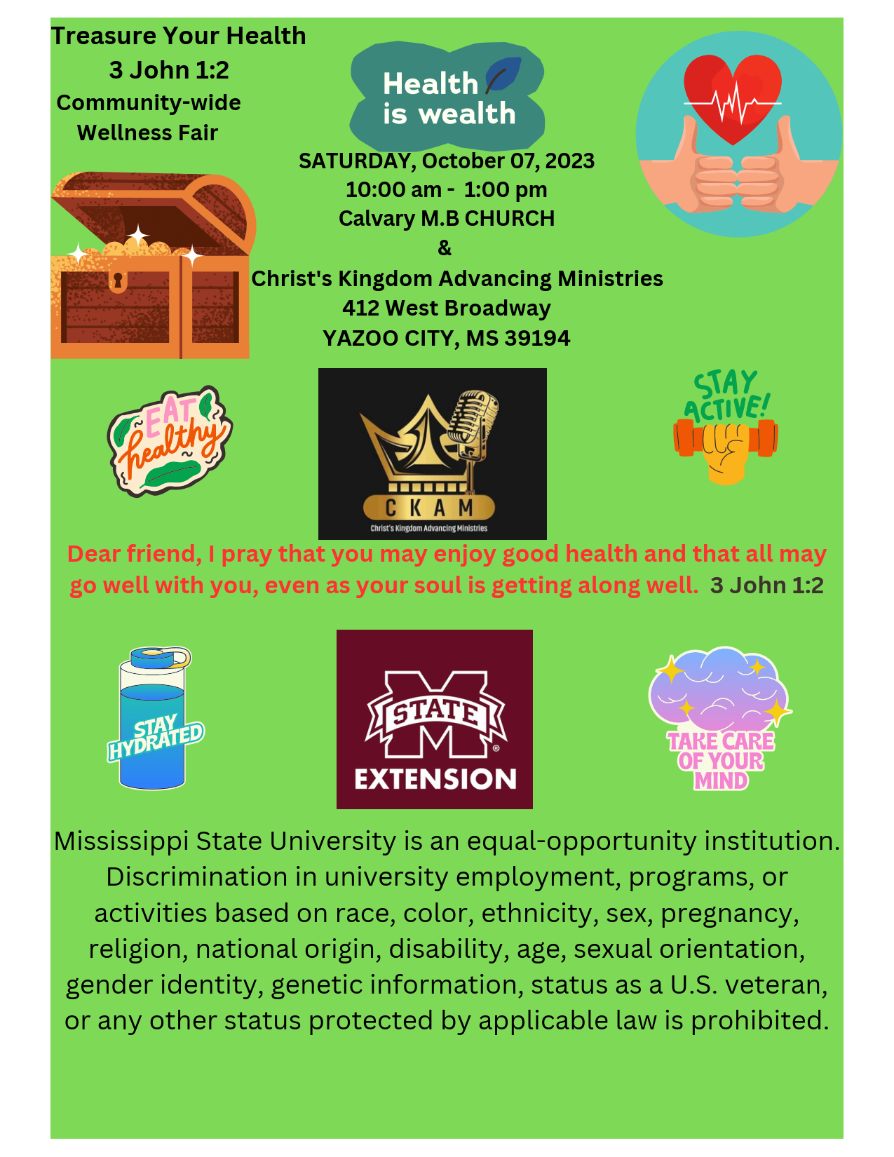 Treasure Your Health (3 John 1:2) Community-wide Wellness Fair will be held from 10:00 a.m. - 1:00 p.m. on Saturday, October 7, 2023. |