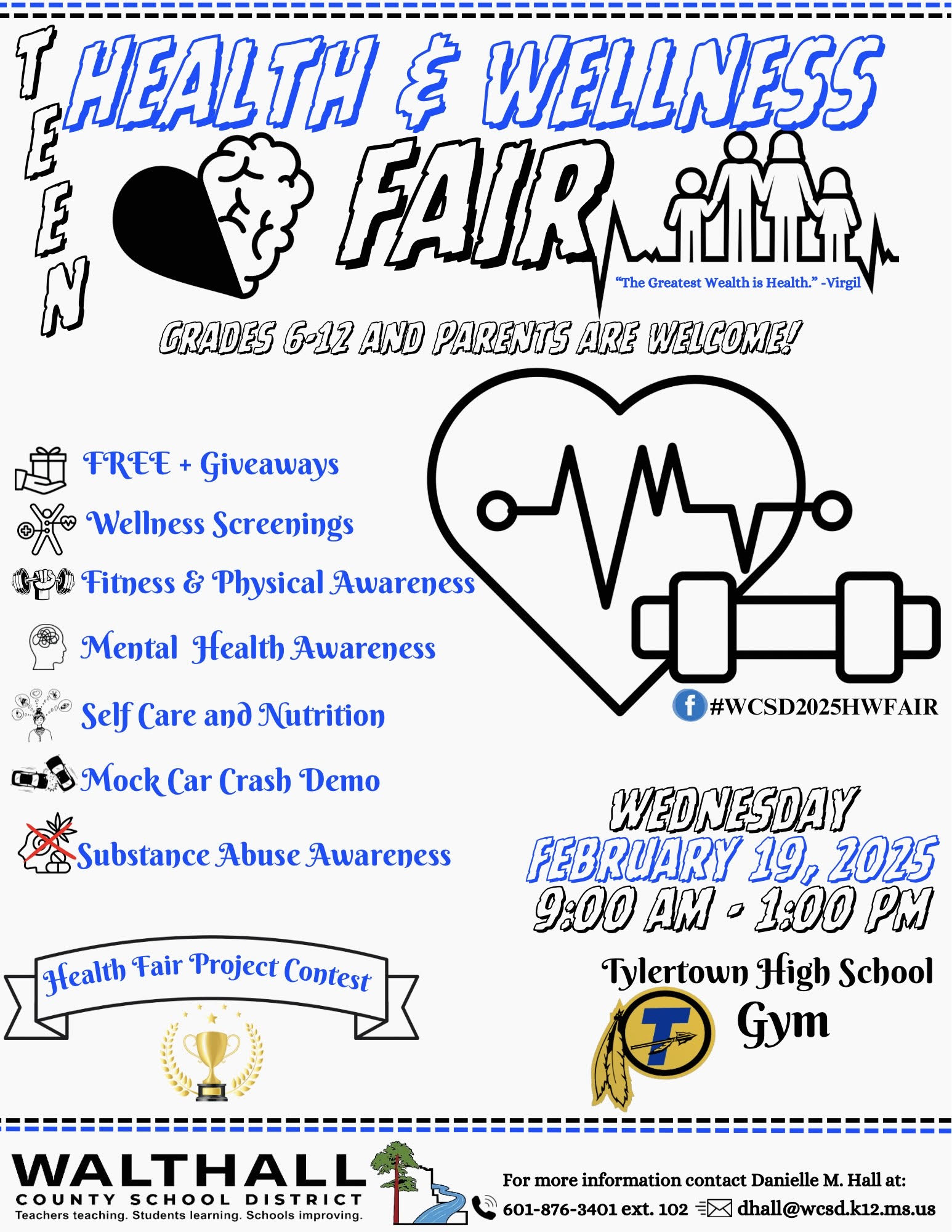 Join the Walthall County School District on February 19th from 9:00 AM to 1:00 PM at the Tylertown High School Gym for the Teen Health & Wellness Fair.