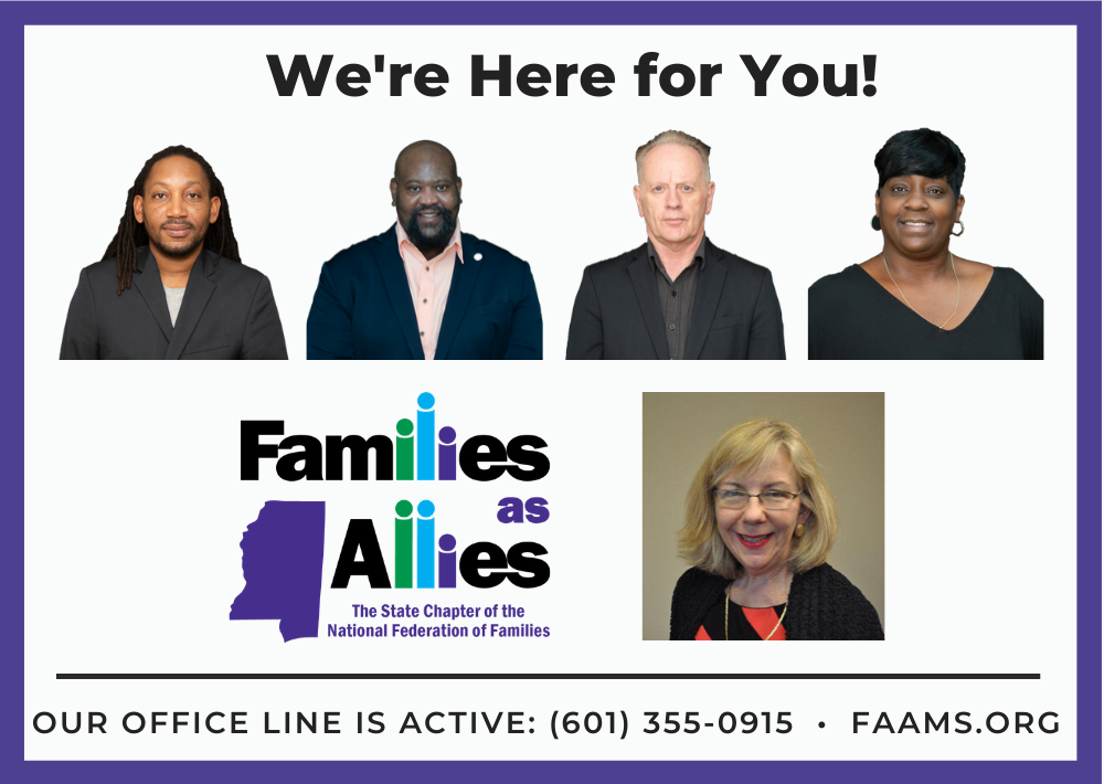 Staff members of Families as Allies are working remotely for the sake of everyone’s safety. We can still be reached by phone (601-355-0915) and email (info@faams.org).