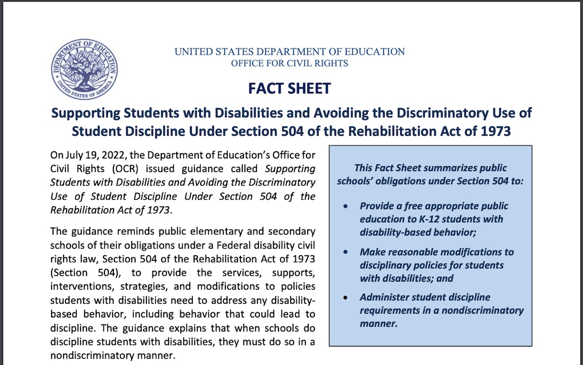 - Supporting Students with Disabilities and Avoiding the Discriminatory Use of Student Discipline under Section 504 of the Rehabilitation Act of 1973 and an accompanying Fact Sheet.