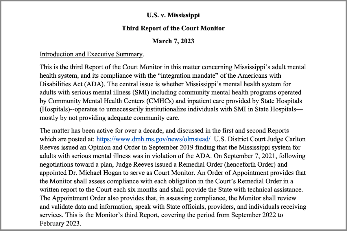 In 2019, after a four-week trial, Judge Carlton Reeves ruled that Mississippi’s mental health system violates the Americans with Disabilities Act (ADA) because adults with mental illness end up segregated in facilities due to not having the support they need. Judge Reeves then imposed a remedy on the state mental health system, a set of conditions the system must meet to comply with the ADA. He appointed Dr. Michael Hogan to monitor the State’s implementation of the remedy.